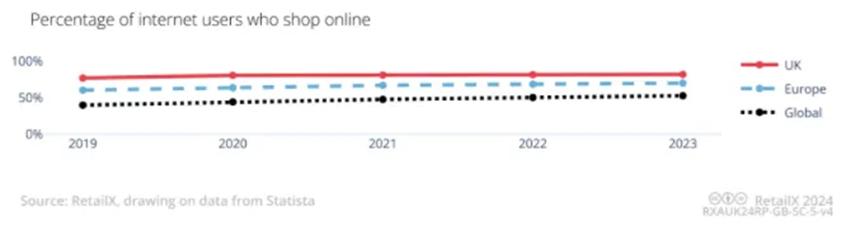 值得一提的是,由于電商存在一定程度上的性價比優勢,越來越多的英國消費者都開始熱衷于網購。一份來自RetailX的研究顯示,截止到2023年,英國的網購用戶滲透率已經達到了驚人的81.9%。同時,42%的英國消費者每月都會進行網購,而37%的消費者每周都會網購。