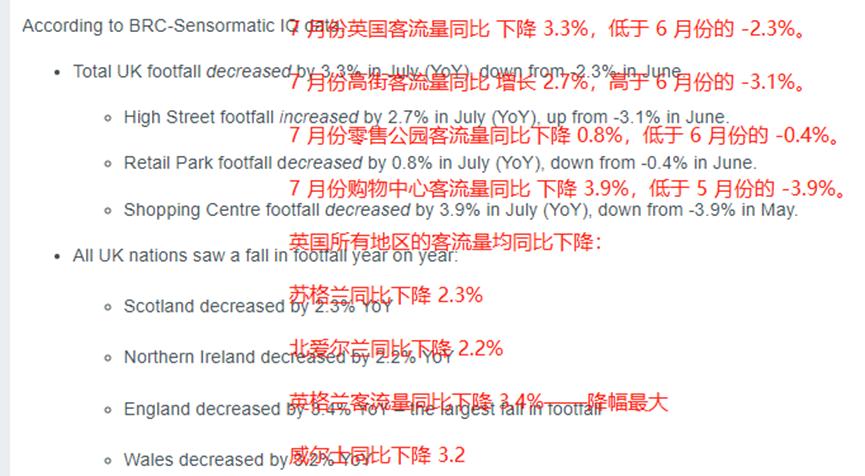具體來看,7月,英國街道客流量同比增長了2.7%,但零售公園的客流量同比下降了0.8%,降幅大于6月份的0.4%。與此同時,該月英國購物中心的客流量同比下降最為明顯,降幅達到了3.9%。而從地區來看,7月英國蘇格蘭、北愛爾蘭、英格蘭和威爾士的客流量都出現了下降,降幅在2.2%—3.4%不等。