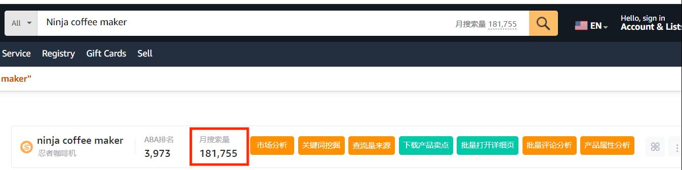 “Ninja coffee maker”關(guān)鍵詞亞馬遜搜索量達(dá)18萬次 圖源:SellerSprite?