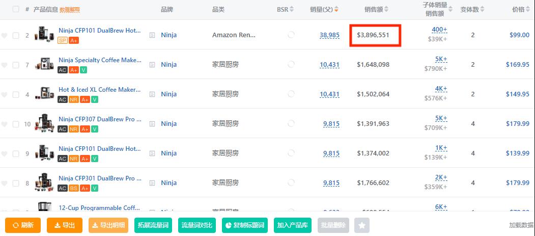 Ninja咖啡機(jī)單品月銷389.6萬美金 圖源:SellerSprite