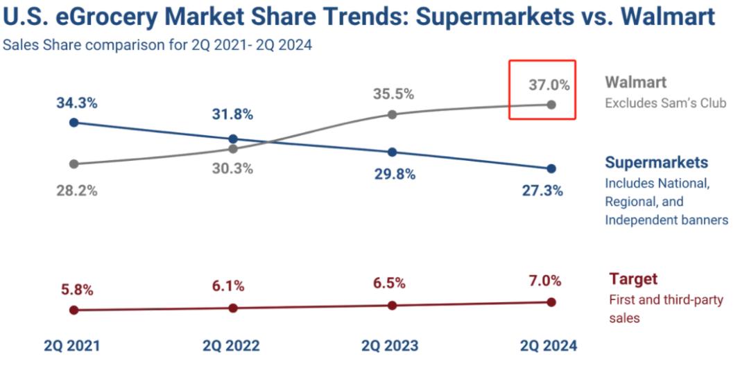 日前,《2024年第二季度美國在線雜貨市場份額報告》新鮮出爐,數據顯示,沃爾瑪(不含山姆會員店)在當季成功占據了美國在線雜貨市場37%的份額,較去年同期大幅增長了150個基點,創下了歷史新高。這一數據不僅鞏固了沃爾瑪在該領域的領先地位,也進一步拉大了與其他競爭對手的距離。