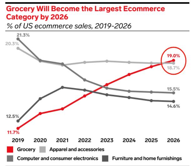 其實,沃爾瑪的這一成績不僅彰顯了沃爾瑪在電子商務領域的深厚底蘊,也反映了美國在線雜貨市場的蓬勃發展和巨大潛力。來自eMarketer的數據顯示,到2026年,在線雜貨銷售預計將占據美國電商總銷售額的19%,超越服裝和配飾。Verified Market Research也預測,2030年,美國在線雜貨市場規模將達到599.4億美元,復合年增長率高達9.31%。