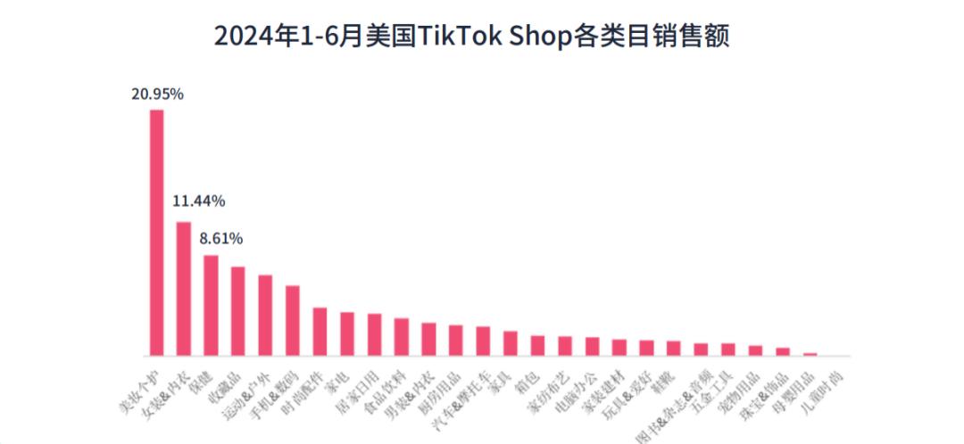 在美妝市場最為成熟的美國,TikTok的影響力更是非同凡響。根據(jù)FastMoss最新發(fā)布的《2024年半年度TikTok生態(tài)發(fā)展白皮書》,2024年上半年,美妝個(gè)護(hù)品類穩(wěn)居TikTok美區(qū)第一大熱門品類,占據(jù)平臺(tái)商品銷售總額的20.95%,遙遙領(lǐng)先排名第二的女裝及內(nèi)衣品類(11.44%)。
