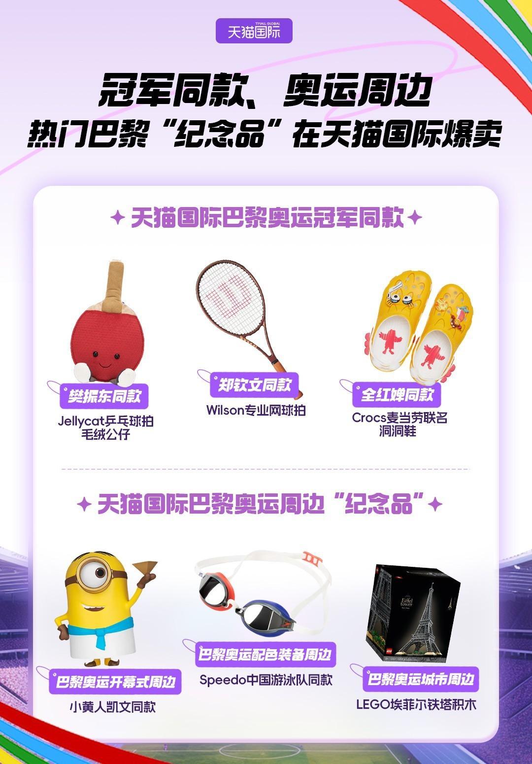 8月10日消息,天貓國際數據顯示,過去兩周,巴黎奧運冠軍同款商品銷售火爆。鄭欽文同款Wilson PRO STAFF V14網球拍在天貓國際搜索量環比增長400倍,成交增長405%,全紅嬋同款Crocs麥當勞聯名款洞洞鞋搜索量環比增長56倍,樊振東同款Jellycat乒乓球拍毛絨公仔成交增長1425%。