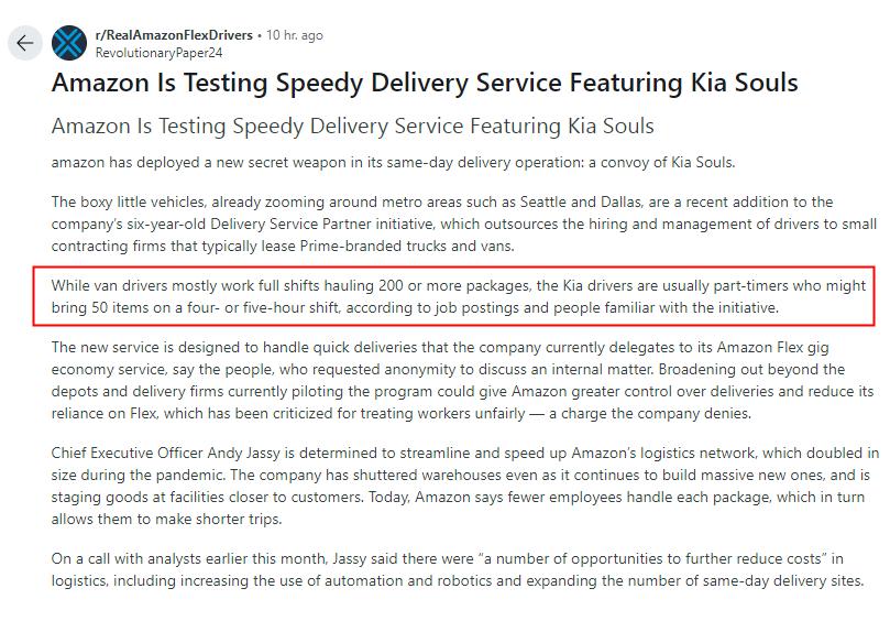 亞馬遜送貨服務(wù)合作伙伴計(jì)劃實(shí)施六年以來,將司機(jī)招募與管理的職責(zé)外包給那些通常租賃Prime品牌卡車的小型承包公司。貨車司機(jī)大多是全職員工,每天負(fù)責(zé)運(yùn)送200個(gè)或更多的包裹,而起亞司機(jī)則是兼職,通常在四至五小時(shí)的輪班中運(yùn)送約50件包裹。