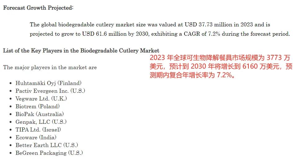 Fortune Business Insights的數(shù)據(jù)顯示,2023年全球可生物降解餐具市場規(guī)模為3773萬美元,預(yù)計到2030年將增長到6160萬美元,預(yù)測期內(nèi)復(fù)合年增長率為7.2%。在這個獨具一格的賽道上,主要玩家有Biotrem、Vegware Ltd、Pactiv Evergeen Inc.等。