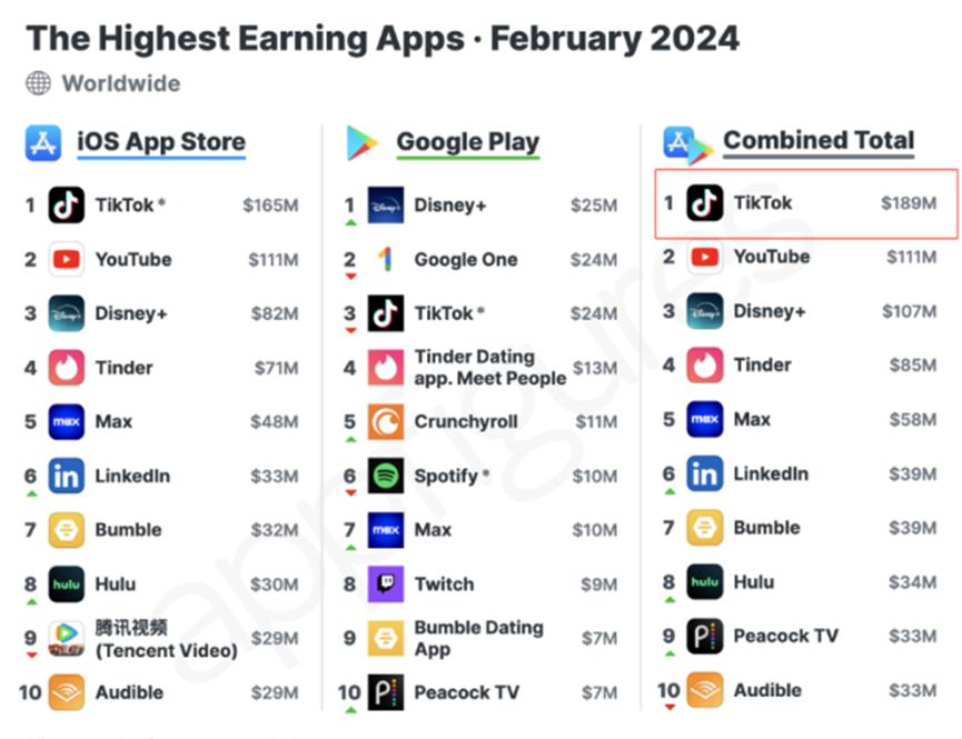 研究表明,有74%的Z世代用戶會使用TikTok搜索商品,并且這些消費者在TikTok看上某樣商品后會產生購買欲望。而Appfigures公布的全球應用程序收入排行榜則指出,今年2月份,TikTok憑借1.89億美元的成績成為全球收入最高的應用程序,其吸金能力可見一斑。