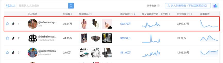 數據顯示,7月份TikTok達人總體帶貨趨勢為增長,其中來自美國的Alle(@influencedqueens)表現最佳。過去一個月中,這位美國姑娘在TikTok的帶貨金額接近100萬美金,內容觀看次數達到3597.17次,而她賬號的粉絲數量也才36.34萬,這意味著其內容具有廣泛吸引力,不僅限于粉絲內部,且在流量變現方面也是潛力巨大。