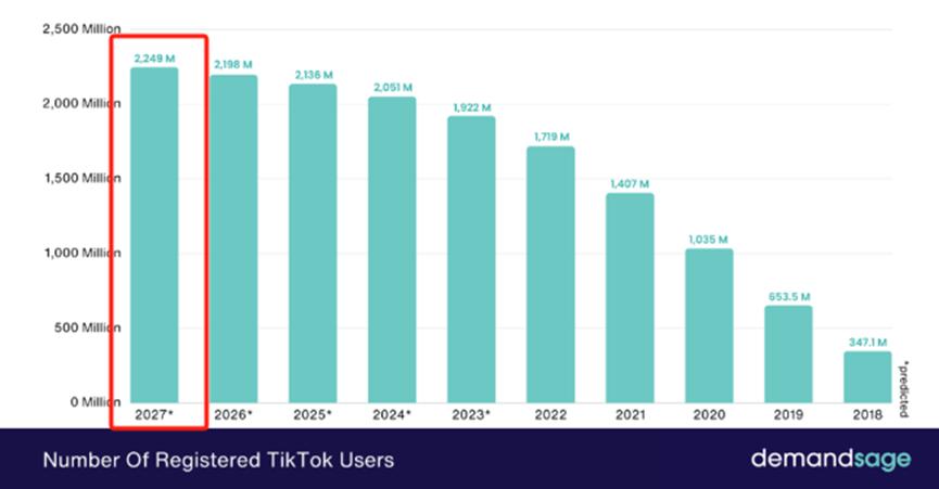 2027年TikTok注冊用戶將突破22億 圖源:Demandsage