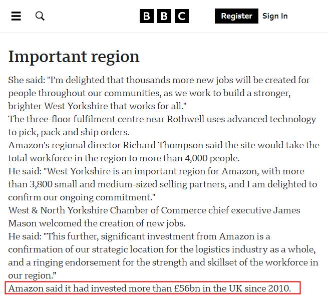 亞馬遜自2010年以來已在英國投資超過560億英鎊,在為英國消費者提供便利、選擇和價值的同時,亞馬遜還幫助數十萬小企業和內容創作者實現了數字化賦能。