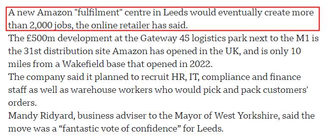 文章來源于互聯網:亞馬遜投資5億英鎊在英國利茲開設新配送中心