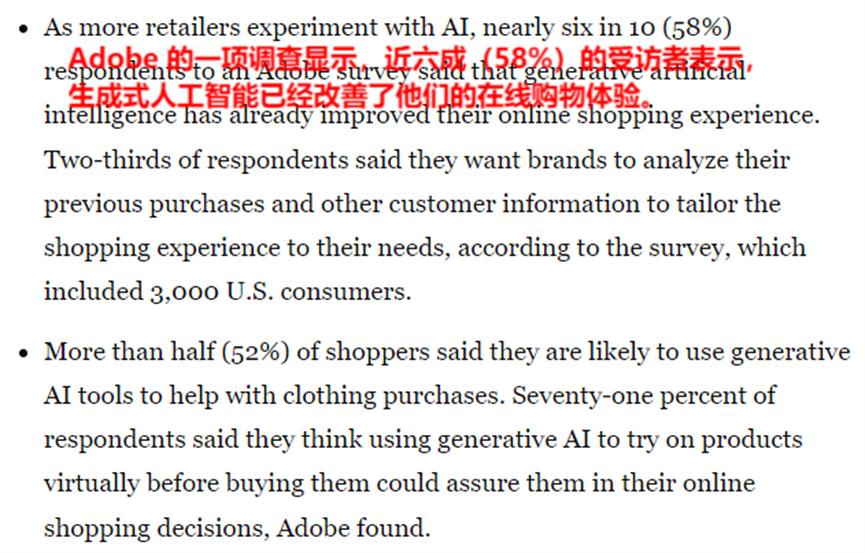 不僅如此,對(duì)于電商消費(fèi)者而言,人工智能技術(shù)也能提供許多便利。一份來自Adobe的調(diào)查報(bào)告顯示,大多數(shù)消費(fèi)者都認(rèn)為AI技術(shù)改善了他們的購(gòu)物體驗(yàn)。具體而言,高達(dá)71%的受訪消費(fèi)者表示,使用AI功能虛擬試用產(chǎn)品讓他們?cè)诰€上購(gòu)物時(shí)更安心;超過半數(shù)的受訪消費(fèi)者表示他們樂意在購(gòu)買服裝前使用AI功能。