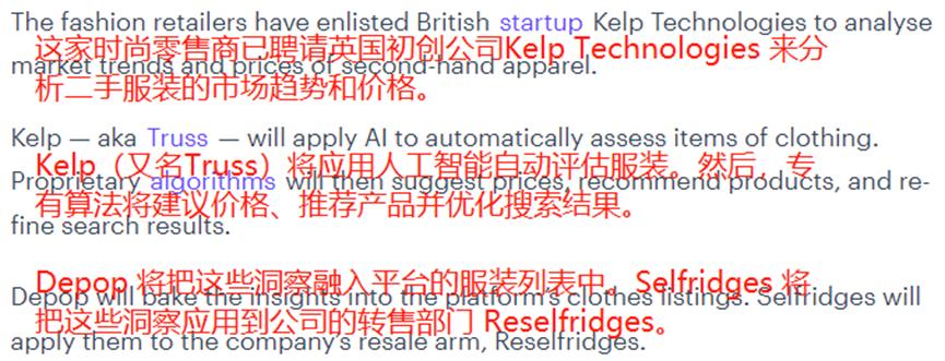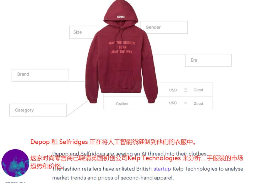 據(jù)了解,Depop計(jì)劃聘請(qǐng)一家名為“Kelp Technologies”的英國(guó)初創(chuàng)公司,該公司會(huì)使用AI技術(shù)來評(píng)估服裝產(chǎn)品,利用專有算法得出建議價(jià)格和推薦產(chǎn)品,同時(shí)還能在一定程度上優(yōu)化搜索結(jié)果。這之后,Depop會(huì)把這些分析數(shù)據(jù)應(yīng)用到平臺(tái)的服裝銷售活動(dòng)中,Selfridges也會(huì)把它們應(yīng)用到公司轉(zhuǎn)售部門的業(yè)務(wù)中。