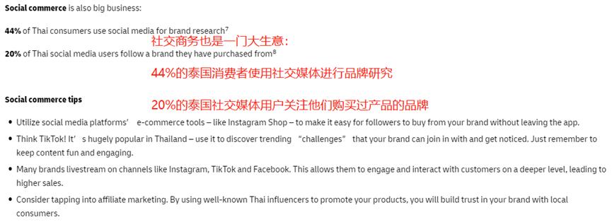 值得一提的是,當前,社交電商正在泰國蓬勃發展著。報告指出,泰國商家們已經習慣在Instagram、TikTok和Facebook等社媒平臺上進行宣傳,消費者也樂于在社媒上尋找商品信息。數據顯示,將近半數(44%)的泰國消費者會利用社交媒體來研究他們感興趣的品牌,還有20%的泰國社媒用戶會持續關注他們購買過的產品的品牌。