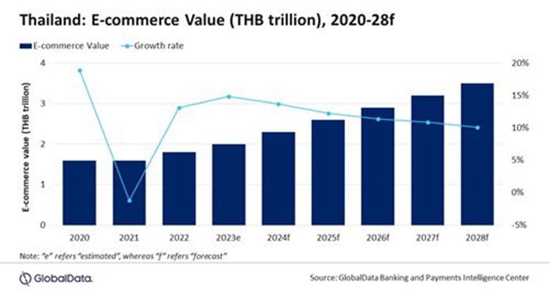 一份來自GlobalData的數據顯示,2019年—2023年期間,泰國電商市場的規模以11.1%的復合年增長率持續擴大著。今年,隨著越來越多的消費者轉向在線購物,泰國電商市場的增長率有望達到13.7%,規模為2.3萬億泰銖(約合667億美元)。未來4年,這一市場的規模還將持續增長,預計復合年增長率為11.2%。到了2028年時,其規模可能會達到3.5萬億泰銖(約合1019億美元)。