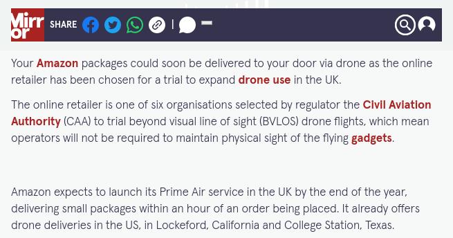 亞馬遜已在美國加利福尼亞州、洛克福德和德克薩斯州大學城提供無人機送貨服務。亞馬遜Prime Air負責人表示,計劃在未來繼續擴大無人機部署,開設更多的設施。
