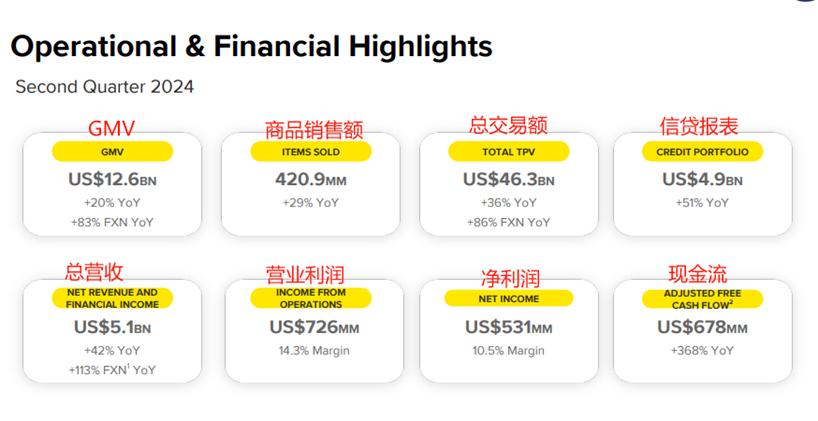 美客多的財務數據便是其穩健發展的有力證明之一。根據最新財報,2024年第二季度,美客多多項關鍵業績指標表現亮眼。具體來說,在該季度,美客多實現了GMV達126億美元,同比增長20%,顯示出市場需求的持續旺盛。同時,其凈收入達到5.31億美元,較去年同期大漲103%,遠超分析師預期。營業收入更是達到51億美元,較去年同期增長42%。