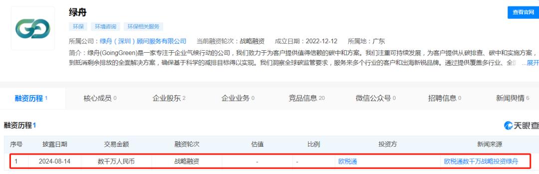據了解,綠舟業務覆蓋碳排查、碳行動實施方案、亞馬遜氣候友好綠標認證、碳足跡等全球碳合規模塊,為用戶提供從碳排查、碳中和實施方案到抵消剩余排放的全面解決方案。歐稅通對綠舟的戰略投資,不僅是對綠舟專業能力和市場潛力的認可,更是雙方在碳合規領域深度合作的重要一步。