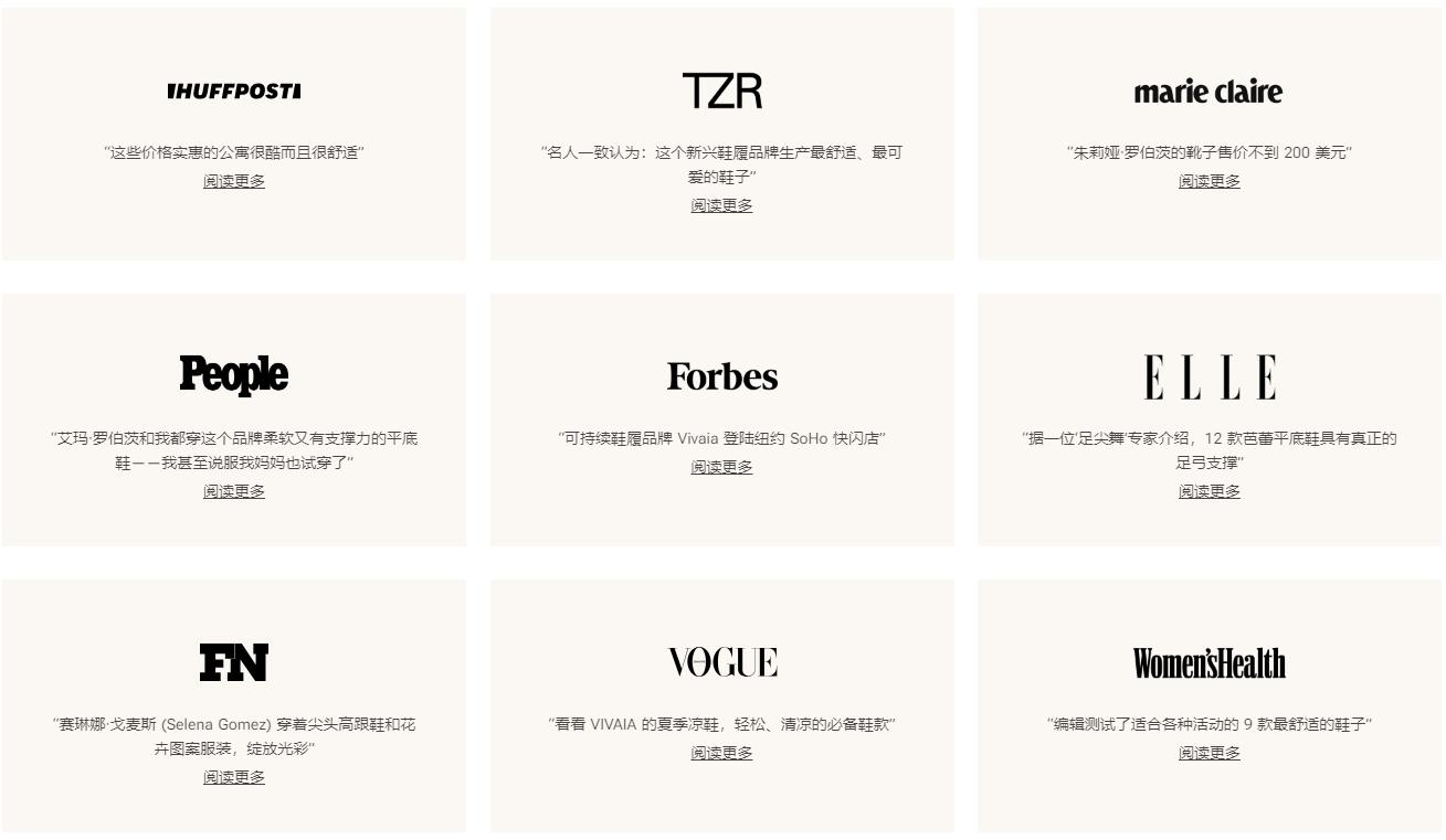 除此之外,Vivaia也深喑時尚造勢的道理。在其官網的媒體文章合集中,有來自福布斯、ELLE、VOGUE等時尚圈內知名的媒體推文,這些文章在名人造勢之后,又進一步地穩固了Vivaia在時尚圈內的地位。