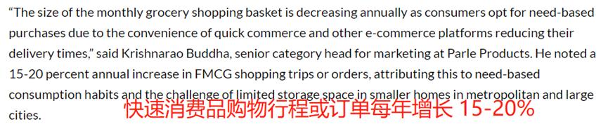說回印度快消品市場,從購買的快消品的數(shù)量來看,兩年前印度消費者平均每個季度會購買163—179件快消品。而過去一年,這些數(shù)字增長到了199—202。同時有數(shù)據(jù)顯示,近些年來,印度快消品購物的行程或訂單量每年都會增長15—20%,增速可以說是很明顯了。