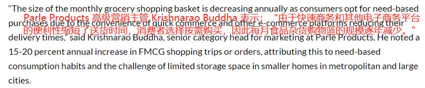 與此同時,由于物流的發(fā)展,能為消費者提供即時配送服務(wù)的“快商務(wù)”得到了快速增長,從而在很大程度上縮減了消費者收到快消品的時間,為他們提供了更多便利。正如印度食品公司Parle Products 的高級營銷主管所言:“由于快速商務(wù)和其他電子商務(wù)平臺的便利性縮短了送貨時間,消費者選擇按需購買。”
