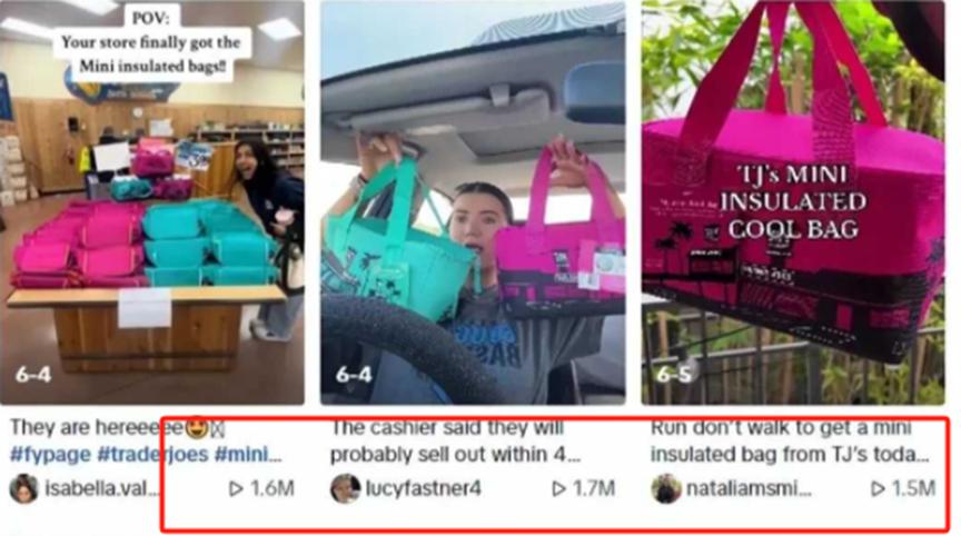 前段日子在北美市場爆火出圈的Trader Joe’s冷藏袋就是最好的案例。相關(guān)數(shù)據(jù)顯示,目前TikTok上與Trader Joe’s冷藏袋有關(guān)的帖子超過470萬條,其中不乏播放量數(shù)百萬的超級熱門視頻。這波空前熱度也讓這款冷藏袋徹底賣爆,不僅線下門店大排長龍,而且二手平臺上的轉(zhuǎn)售價格更是狂飆至10倍以上。