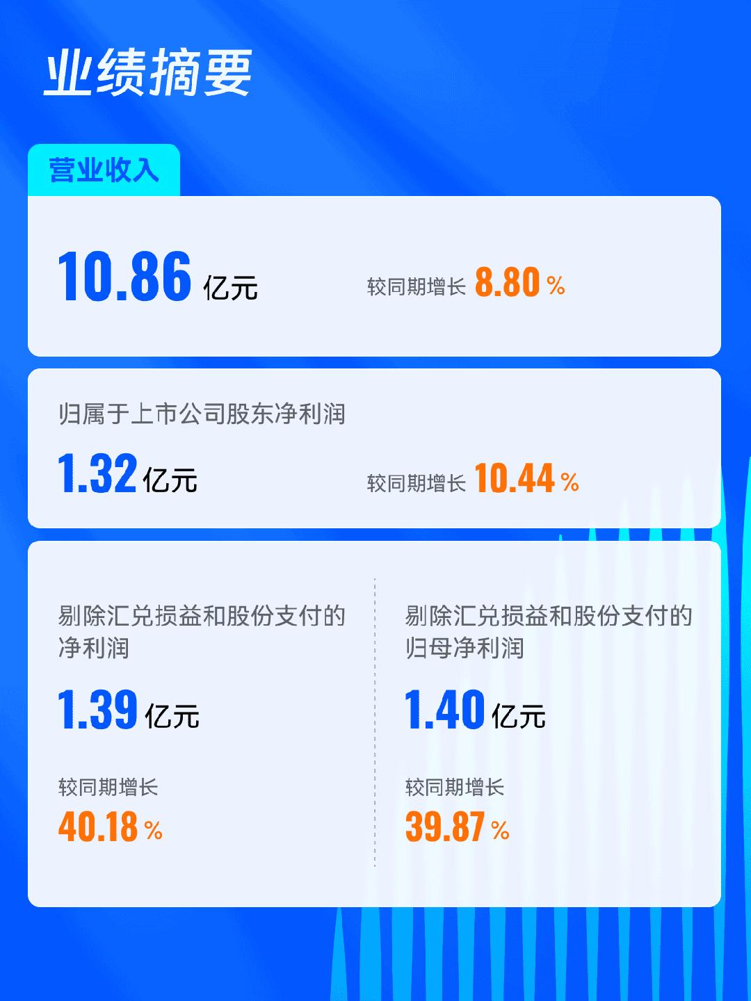 歸屬于上市公司股東的凈利潤(rùn)為1.32億元,同比增長(zhǎng)10.44%。歸屬于上市公司股東的扣除非經(jīng)常性損益的凈利潤(rùn)為1.25億元,同比增長(zhǎng)17.83%。基本每股收益為0.28元。剔除匯兌損益和股份支付的凈利潤(rùn)1.39億元,較去年同期增長(zhǎng)40.18%。