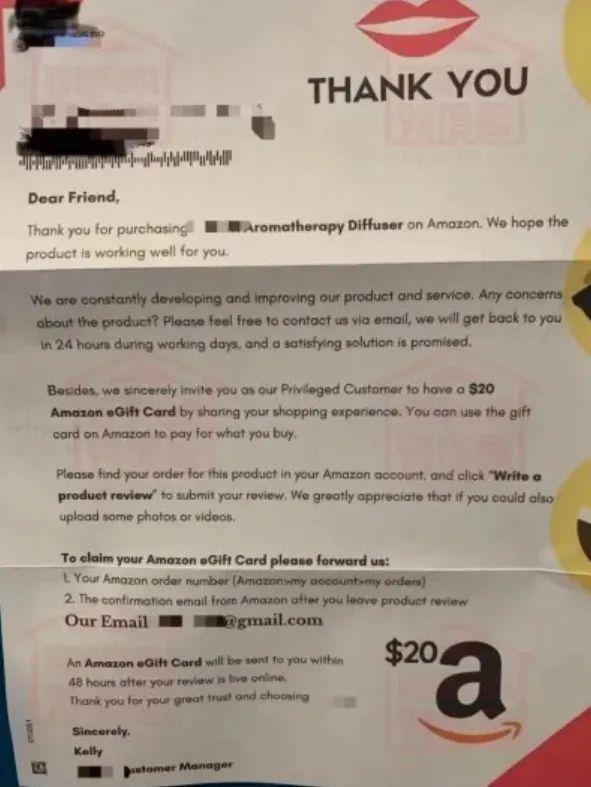 之前,會有亞馬遜賣家在包裹內放上測評小紙條來誘導買家刷好評,但這種行為并不合規因此受到了亞馬遜的禁止。但誘導刷好評的現象并沒有結束,很多賣家會在消費者收到貨后,委托明信片公司單獨寄“明信片”,表示只要“在相應的訂單上寫下產品評論,就可以獲得一張20美元的亞馬遜電子禮品卡。”
