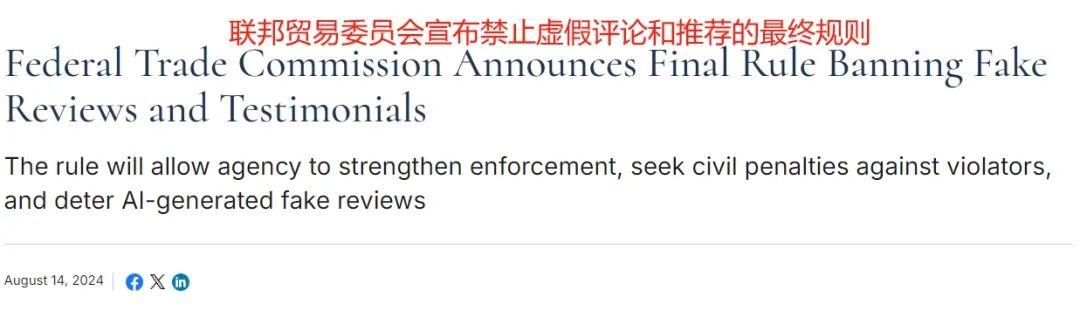 日前,美國聯邦貿易委員會(FTC)確定了一項新規,禁止故意購買或出售虛假在線評論。與此同時還表示,在面對違法行為FTC擁有征收罰款的權力,將對違法者處以最高約51744美元的罰款。