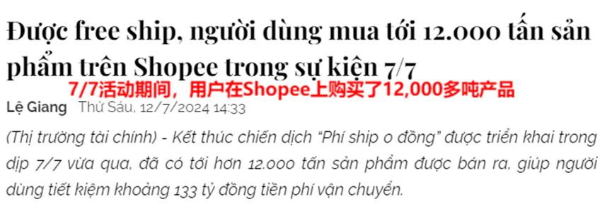 比如東南亞電商霸主Shopee,今年7月底,越南7.7大促正式收官,Shopee在此次活動中再度創下銷售紀錄。根據官方統計數據,Shopee在7.7大促期間的訂單量相較于平時暴漲了超過5倍,商品交易量更是達到了驚人的1.2萬噸,“零運費”計劃商品銷量也尤為驚人,紛紛沖上了暢銷榜。