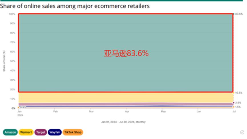 還有亞馬遜,該巨頭也在今年7月的Prime Day大促中交出了一份亮眼的業績答卷,銷售額相比前四周明顯增長了46%。此外,一份來自Earnest Analytics的研究報告顯示,亞馬遜、沃爾瑪、塔吉特、TikTok Shop和Wayfair這幾大零售業巨頭都參與了今年夏季大促,其中亞馬遜占到的市場份額高達83.6%,可謂是遙遙領先。