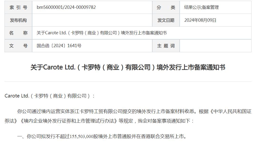 據了解,今年3月8日,卡羅特在港交所遞交了招股書,法國巴黎證券、招銀國際為其聯席保薦人。現如今,其備案已經通過,卡羅特最快或將于今年9月份在香港進行首次公開招股(IPO),預計募資規模將達到1億至1.5億美元。