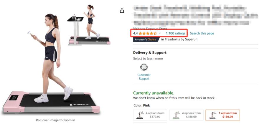 比如說(shuō),主營(yíng)跑步機(jī)的杭州出海品牌SupeRun的一款產(chǎn)品月銷量在8000以上,累計(jì)銷售額達(dá)到數(shù)百萬(wàn)美元,此前還一舉沖上了亞馬遜跑步機(jī)Best Seller榜單的Top 10。在沃爾瑪上,該產(chǎn)品同樣交出了亮眼成績(jī)單,產(chǎn)品綜合評(píng)分高達(dá)4.3分,也是沃爾瑪BS榜上的常見身影。