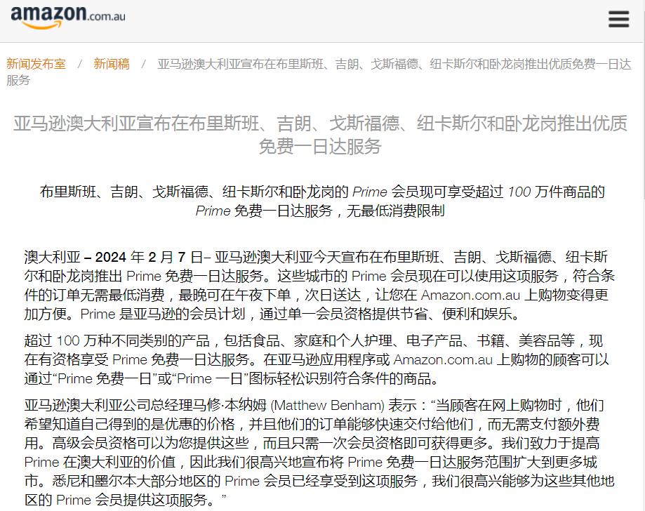 亞馬遜表示,此次將免費當日達送貨帶到悉尼旨在繼續擴大亞馬遜Prime免費當日送達和一日送達服務的產品選擇和配送區域,讓更多澳大利亞Prime會員能夠更快地把心儀產品拿到手。此前,亞馬遜已經在布里斯班、吉朗、紐卡斯爾等地區上線了免費次日達服務,這些地區的Prime會員無需支付任何費用即可享受該服務。