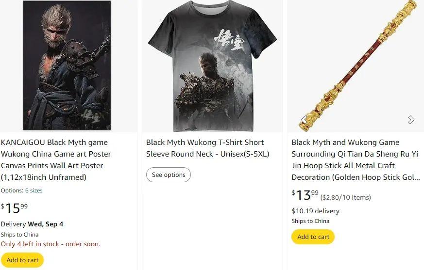 以亞馬遜為例,在平臺中搜索“black myth wukong”關鍵詞,會出現很多相關產品,包括周邊T恤、緊箍咒、金箍棒、游戲手柄、悟空擺件等,價格也從幾十美元到十幾美元不等。