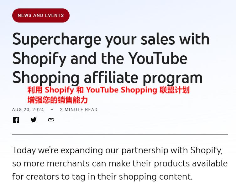 最近,Youtube又宣布了一項新的視頻購物計劃,將與北美電商巨頭Shopify擴大合作,為美國所有符合條件的Shopify Plus和Advanced 商家,提供YouTube Shopping的聯盟計劃。
