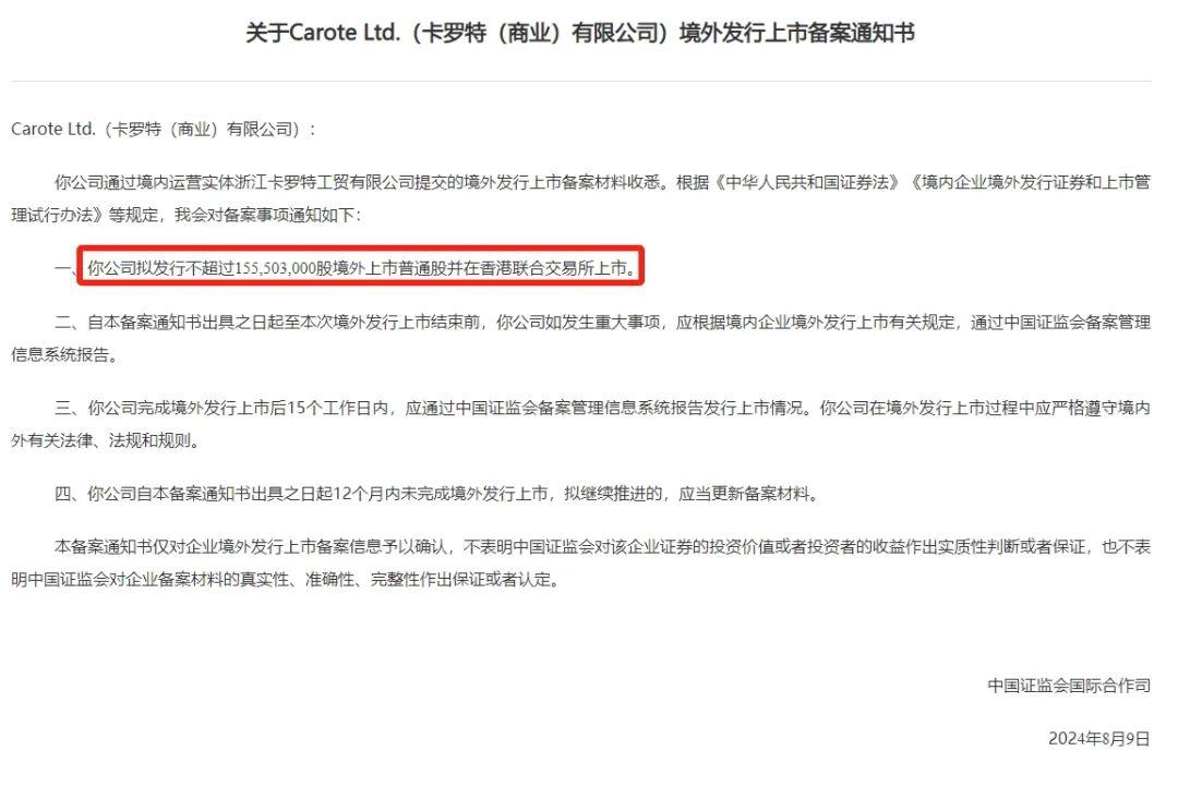 日前,中國證監會官網公告,收到卡羅特(商業)有限公司境外發行上市的備案通知書,從通知書中可以發現,卡羅特可發行約1.55億股境外上市普通股,并在港交所上市。?