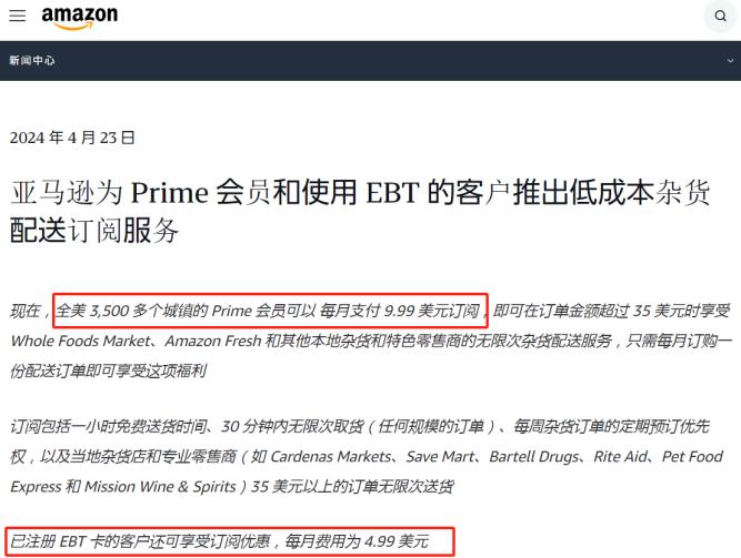 值得一提的是,亞馬遜早就已經(jīng)開(kāi)始試水雜貨配送訂閱服務(wù)。今年4月,亞馬遜為Prime會(huì)員和EBT卡持有者推出了食品雜貨月度訂閱計(jì)劃,Prime會(huì)員每月花費(fèi)9.99美元就可以享受相應(yīng)服務(wù),而對(duì)于EBT卡持有者,這一費(fèi)用還能再減免,僅僅需要4.99美元。
