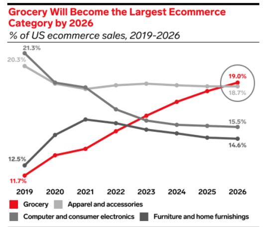 有數(shù)據(jù)顯示,2024年6月份,美國(guó)在線雜貨市場(chǎng)展現(xiàn)出了強(qiáng)勁的發(fā)展態(tài)勢(shì),銷(xiāo)售額同比實(shí)現(xiàn)了8%的漲幅,達(dá)到77億美元。無(wú)獨(dú)有偶,來(lái)自eMarketer發(fā)布的數(shù)據(jù)同樣認(rèn)為該市場(chǎng)存在巨大的發(fā)展?jié)摿Γ?/span>預(yù)計(jì)到2026年,在線雜貨領(lǐng)域?qū)⒊椒b和配飾,預(yù)計(jì)銷(xiāo)售額占據(jù)美國(guó)電商總銷(xiāo)售額的19%,成為電商行業(yè)的領(lǐng)頭羊。