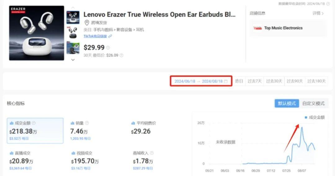 近日,聯想Erazer耳機在TikTok shop美區銷量暴漲,據數據顯示,該產品近一個月最低價為26.09美金,特別是從七月底開始,該產品的銷量更是一路走高,熱度爆表。