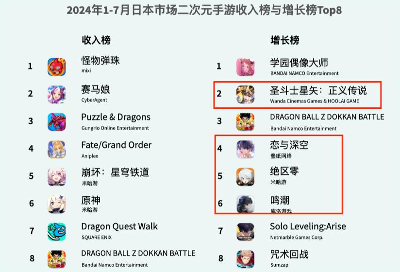例如同一時(shí)期,在日本二次元手游收入增長榜Top8中,就有四款游戲來自中國開發(fā)商,它們分別是北京互愛互動的《圣斗士星矢:正義傳說》、蘇州疊紙網(wǎng)絡(luò)的《戀與深空》、上海米哈游的《絕區(qū)零》、廣州庫洛的《鳴潮》。