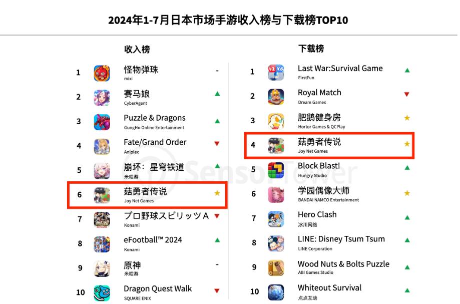 近日,全球移動市場數(shù)據(jù)平臺SensorTower發(fā)布了一項(xiàng)最新的日本手游市場洞察報(bào)告,數(shù)據(jù)顯示,2024年1-7月,國內(nèi)游戲開發(fā)商4399旗下手游《菇勇者傳說》成功登上日本手游收入榜第6、下載榜第4。?