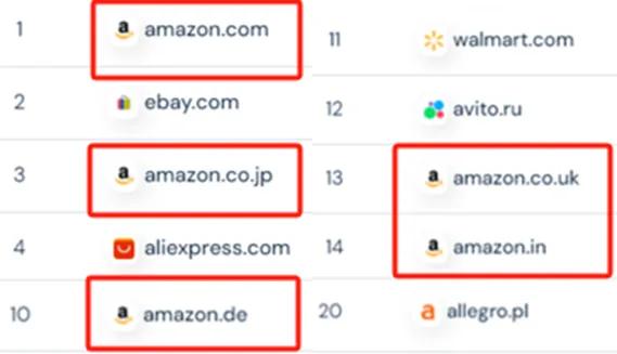 另外根據流量統計網站Similar Web發布的全球電商購物網站流量Top20榜單,亞馬遜網站位列榜首,在前二十名中更是獨占5個席位,前三名中占2個席位,比如在今年5月,亞馬遜網站總訪問量約為23億,斷層領先第二名的eBay(7.03億)。