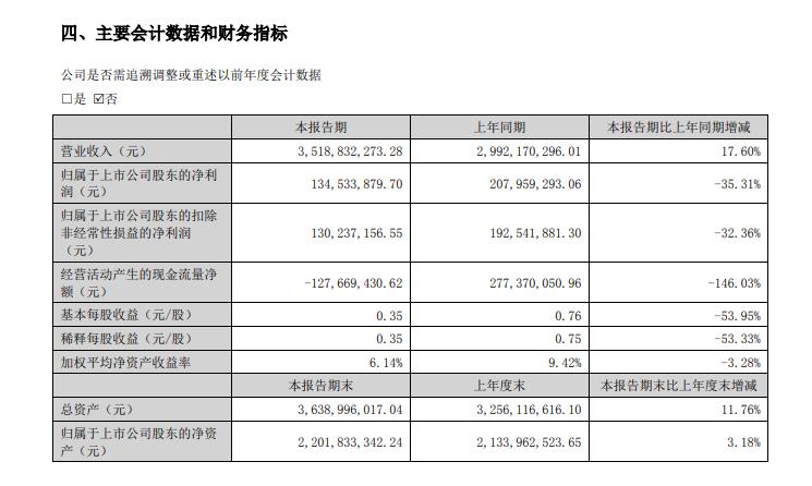 財報顯示,華凱易佰上半年實現營收35.19億元,同比去年增長了17.6%;歸母凈利潤同比下滑35.31%,僅有1.35億元;扣非凈利潤1.3億元,同比下降32.36%;經營活動產生的現金流量凈額為-1.28億元,上年同期為2.77億元。報告期內,華凱易佰基本每股收益為0.35元,加權平均凈資產收益率為6.14%。