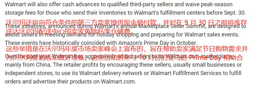 此外,沃爾瑪還計劃給賣家一定程度上的資金支持。據了解,沃爾瑪將會挑選出一些符合條件的第三方賣家,為他們提供現金預付款。并且,對于那些“在9月30日之前將庫存送達沃爾瑪配送中心”的賣家,沃爾瑪將會免除他們的旺季倉儲費。