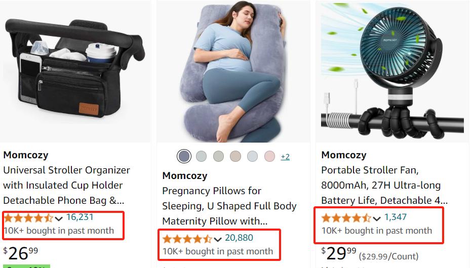 國貨母嬰品牌Momcozy便是成功走向全世界的一員。在亞馬遜平臺上可以看到,在過去的一個月時間里,該品牌許多產品的銷量都超過了1萬件,成為了暢銷品。值得一提的是,Momcozy有多款單品定價雖高,但銷量爆表,沖進了BS榜單前五。在孕婦護理&孕婦文胸、電動吸乳器、孕婦枕頭這三大類目中,Momcozy更是占據(jù)了BS榜單TOP1的位置。