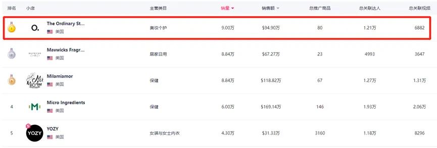 The Ordinary曾登上TikTok美區銷量榜第一 圖源:FastMoss
