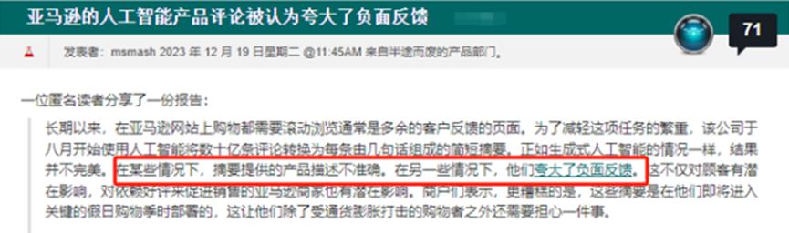 值得一提的是,這已經(jīng)不是亞馬遜AI功能第一次翻車了。早在去年年底,就有賣家反映稱,亞馬遜推出的AI評(píng)論摘要功能存在產(chǎn)品描述不準(zhǔn)確、或者過(guò)于重視差評(píng)的問(wèn)題。