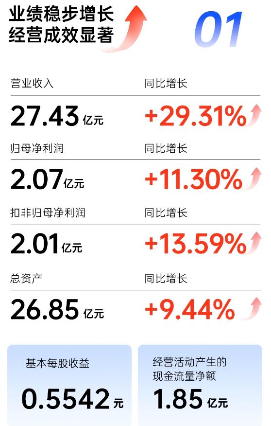 近日,綠聯科技發布2024年半年度報告,數據顯示,報告期內公司實現營業收入27.43億元,同比增長29.31%;歸屬于上市公司股東的凈利潤2.07億元,同比增長11.30%;歸屬于上市公司股東扣除非經常性損益凈利潤2.01億元,同比增長13.59%;基本每股收益0.5542元/股。