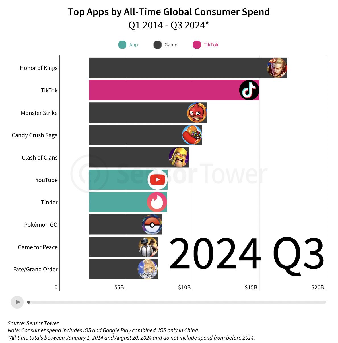 在季度消費(fèi)方面,2024年第二季度,消費(fèi)者在TikTok的應(yīng)用內(nèi)購買支出已經(jīng)超過13億美元,連續(xù)五個季度保持在10億美元以上的水平。這一趨勢若持續(xù),TikTok有望在未來12個月內(nèi)成為消費(fèi)者支出最高的移動應(yīng)用程序。